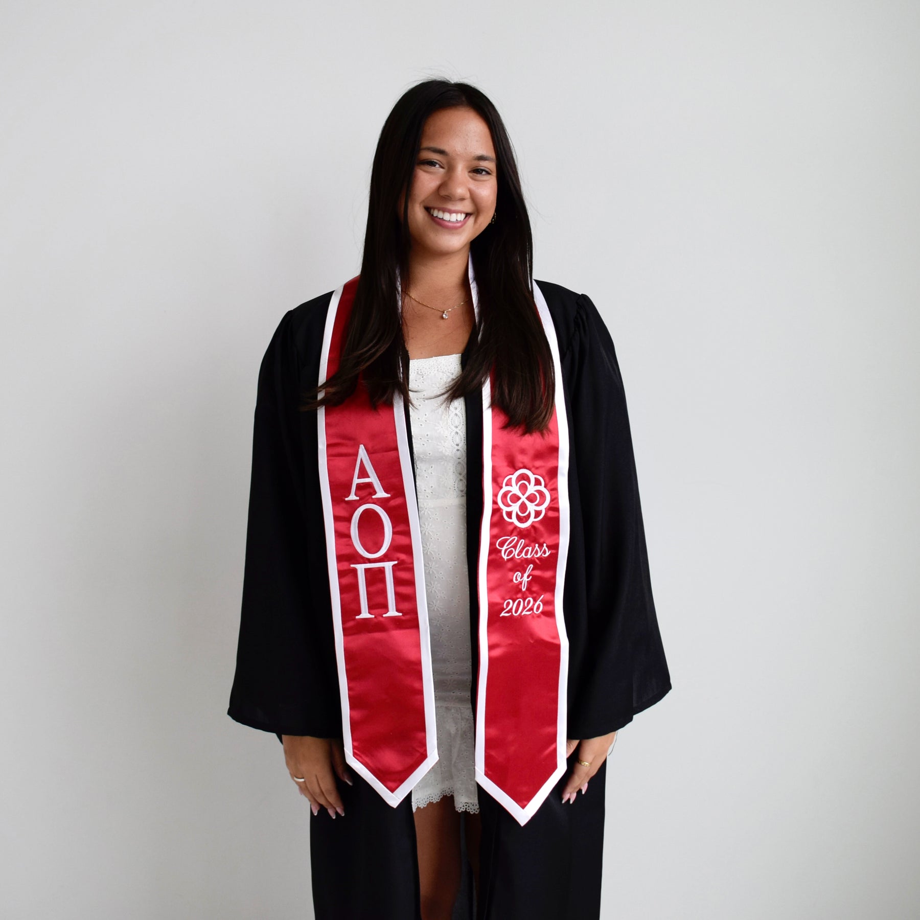 Don't want to go through the process of creating a custom graduation stole? No worries! Here is our "as is" stole.  This stole will have Alpha Omicron Pi's greek letters, crest & your graduation year!