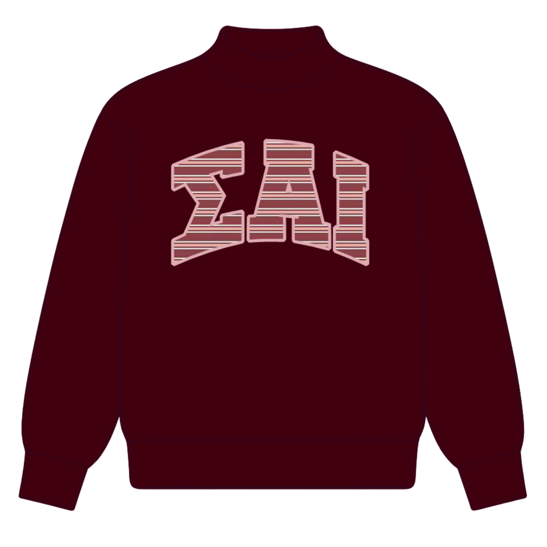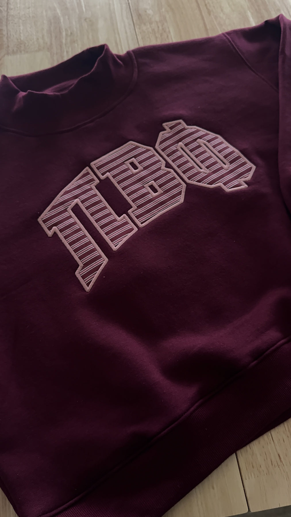 Featuring your choice of Greek letters in fully embroidered pink, white & maroon stripe fabric patchwork design, outlined in mauve satin thread! Perfect for layering or wearing solo, it’s designed to be a wardrobe staple—equal parts laid-back and luxe.