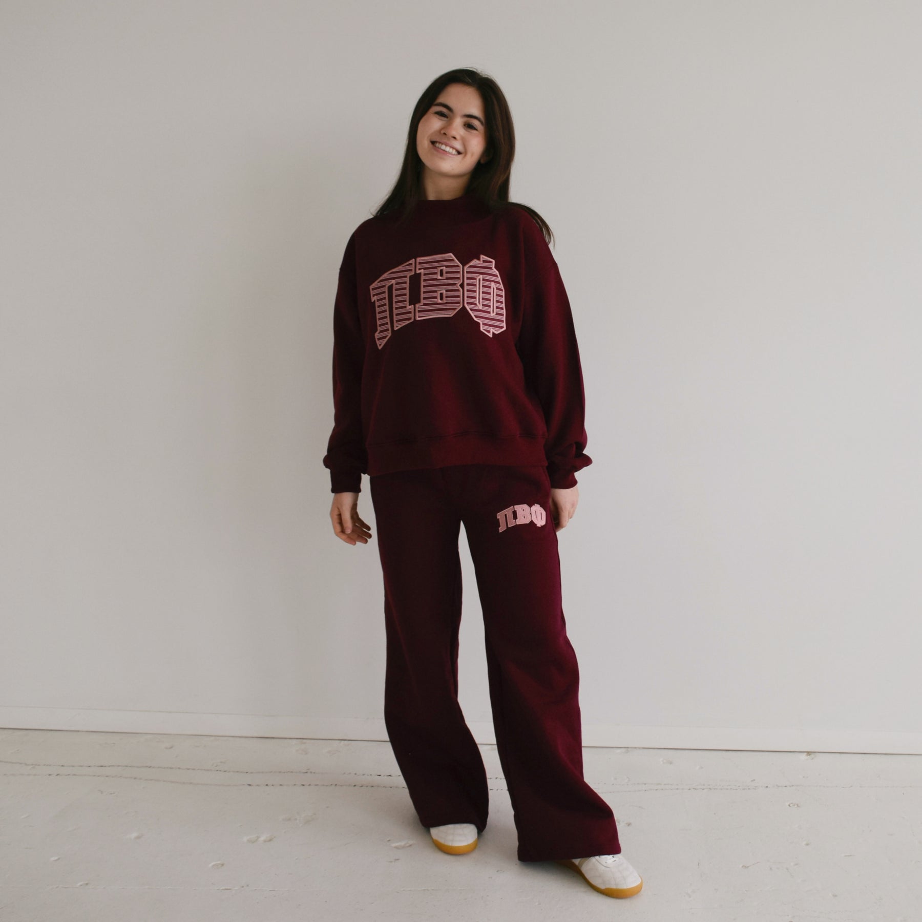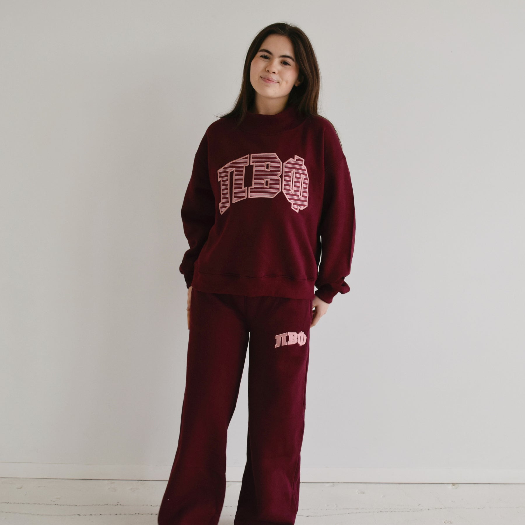 Featuring your sorority greek letters fully embroidered varsity-style design with mauve greek letters, this piece brings a fun twist to a timeless classic. With a relaxed, wide-leg silhouette and an elastic waistband for all-day comfort, they’re perfect for lounging, layering, or stepping out in style.