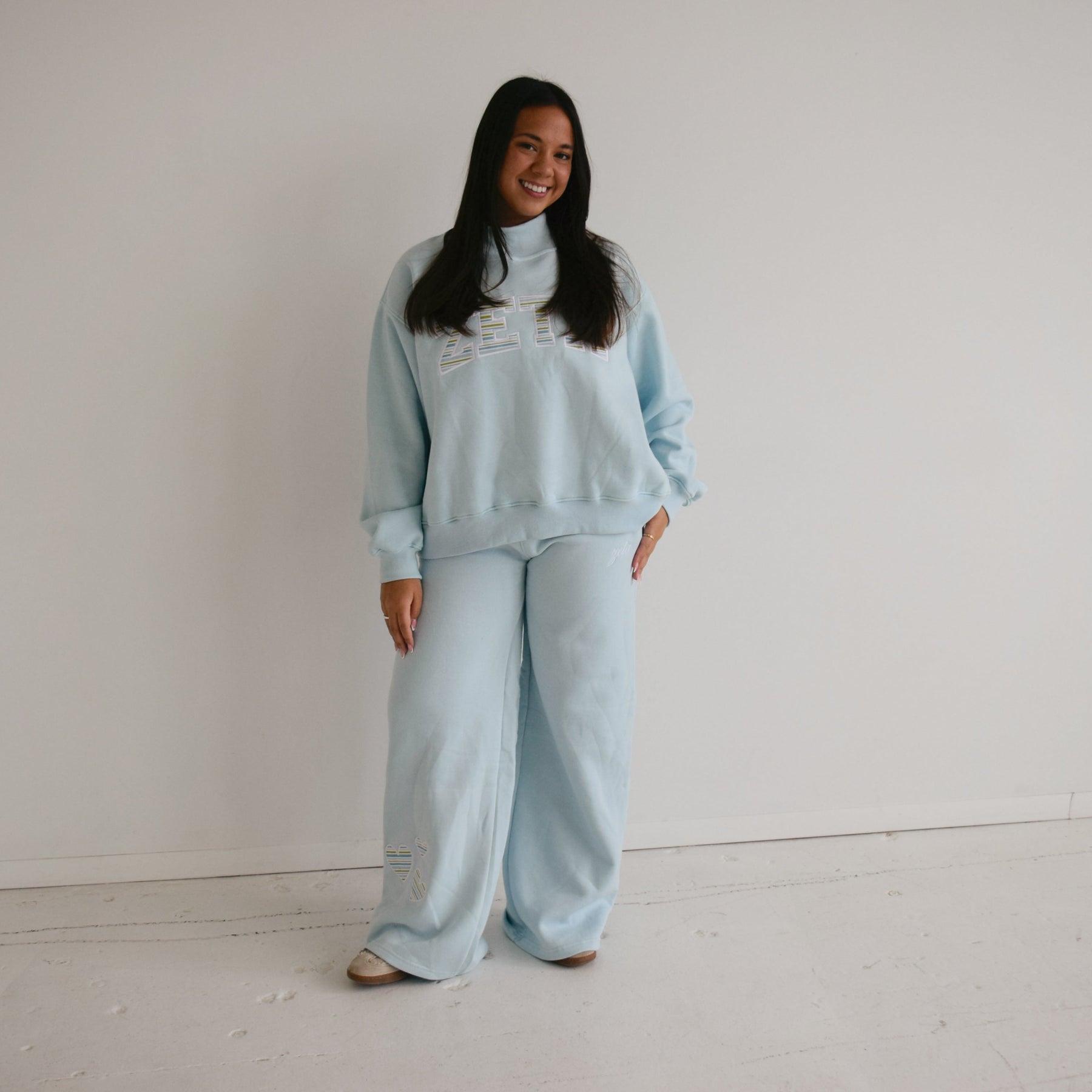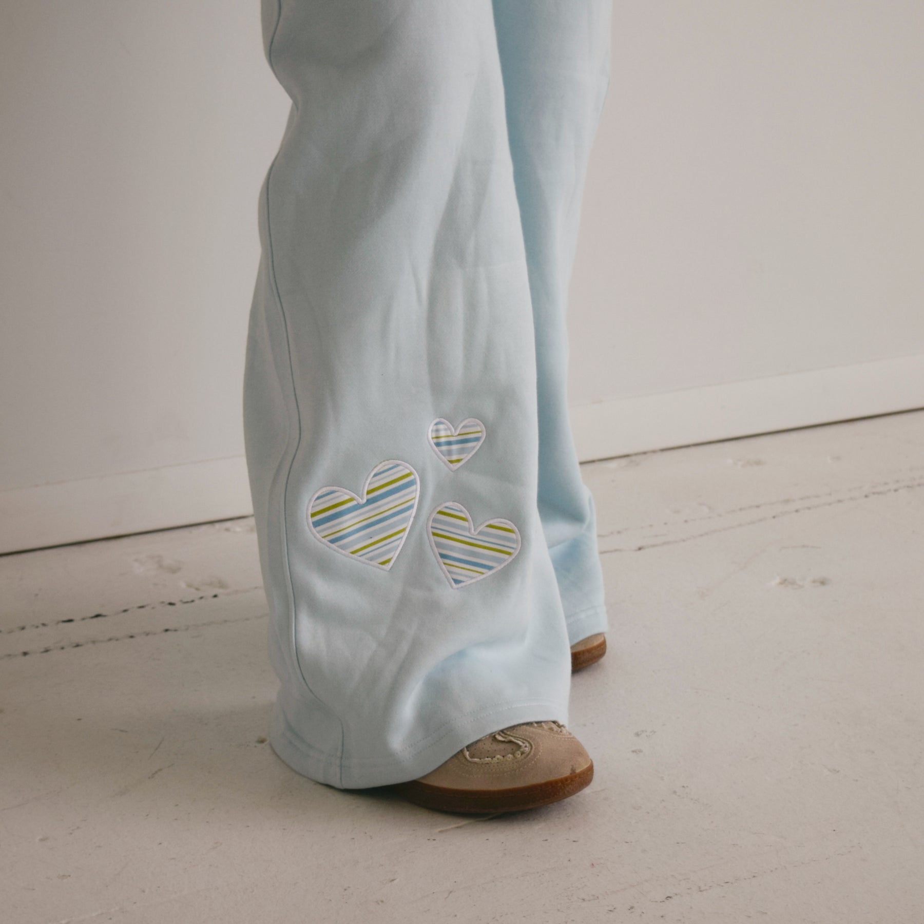 Featuring your sorority in a fully embroidered white script, along with sweet patchwork stripe hearts at the bottom of the right leg. With a relaxed, wide-leg silhouette and an elastic waistband for all-day comfort, they’re perfect for lounging, layering, or stepping out in style.