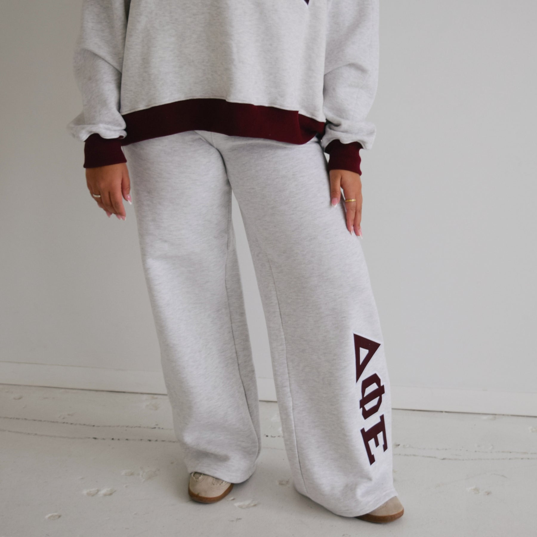 Featuring your choice of sorority in a fully embroidered maroon tackletwill design, these sweats are designed to make a statement while staying ultra-wearable. With a relaxed, wide-leg silhouette and an elastic waistband for all-day comfort, they’re perfect for lounging, layering, or stepping out in style.