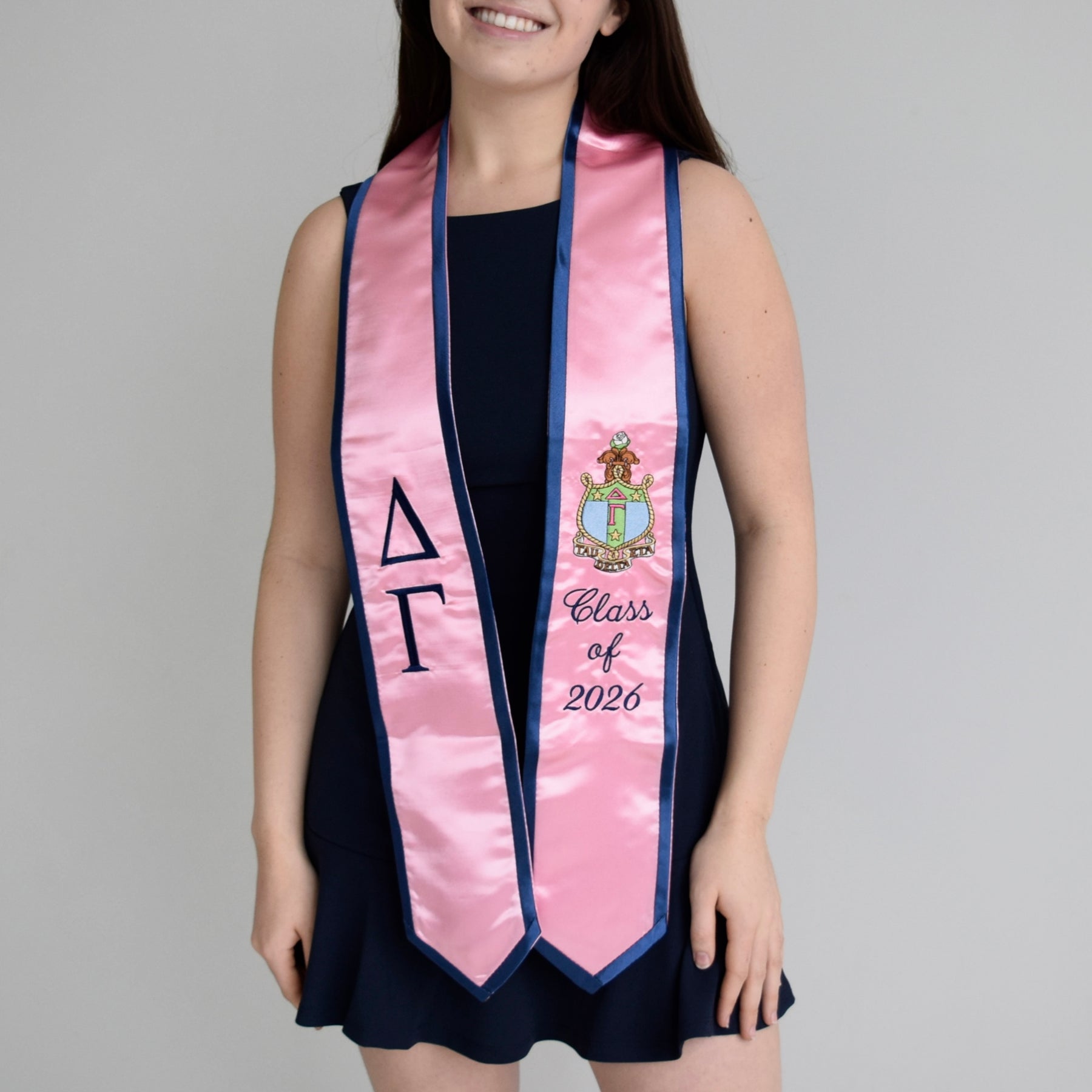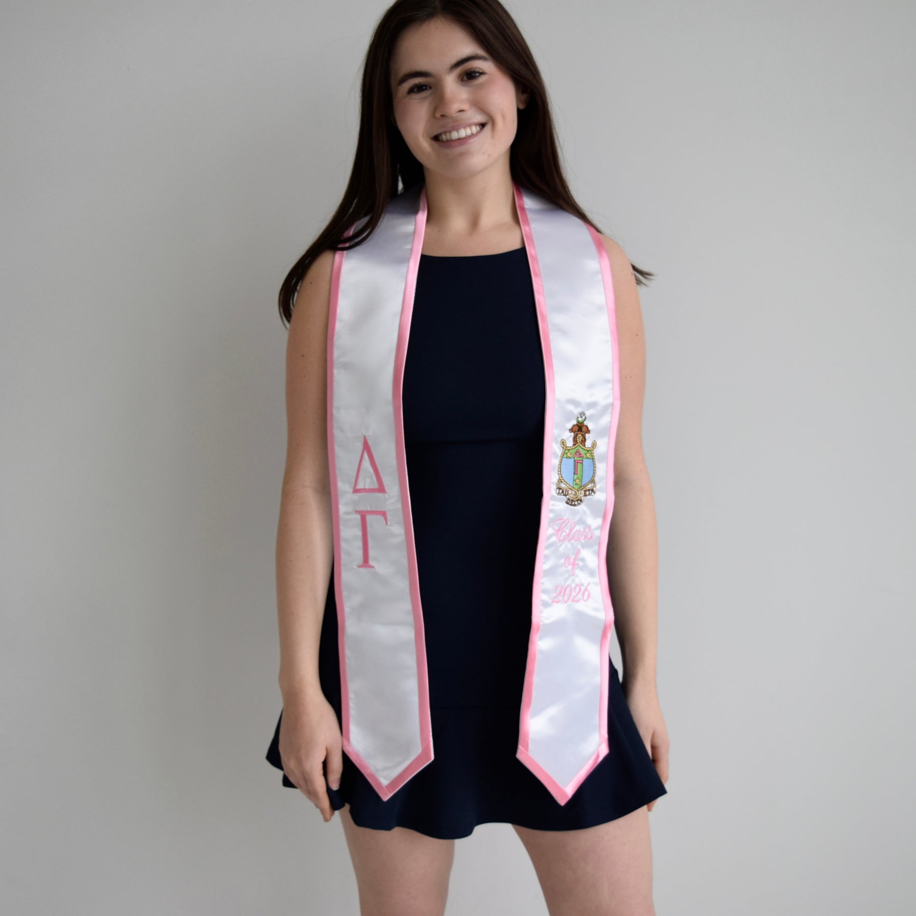 Don't want to go through the process of creating a custom graduation stole? No worries! Here is our "as is" stole. You have the option of three stoles, white with pink or white with navy classic trim. or pink with navy trim This stole will have Delta Gamma's greek letters, crest & your graduation year!